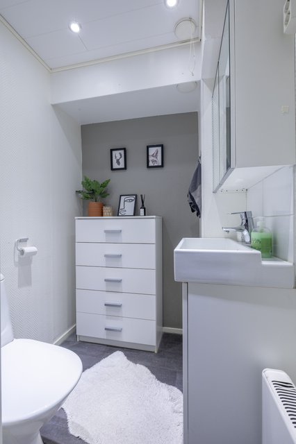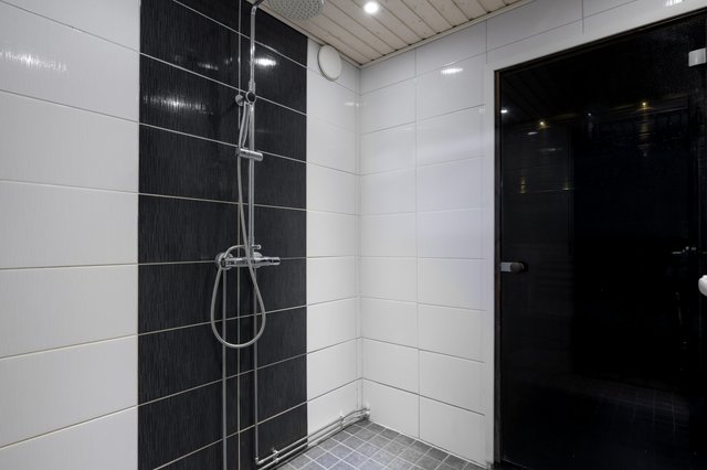 - Pesukoneliitäntä, lattiakaivo, ja tila pesutornille