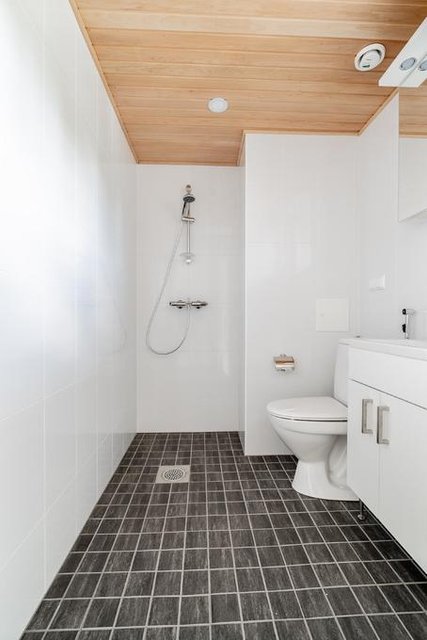 - WC-istuin, suihku, pesukoneliitäntä, lattialämmitys, bidee-suihku, pesuallas, allaskaappi, ja peilikaappi