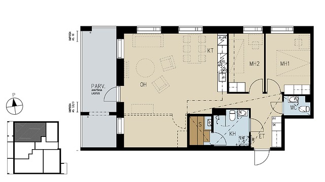 - Huoneistossa kaksi makuuhuonetta. Lisäksi pohjakuvaan on luonnosteltu valmiiksi paikka kolmannellekin makuuhuoneelle.