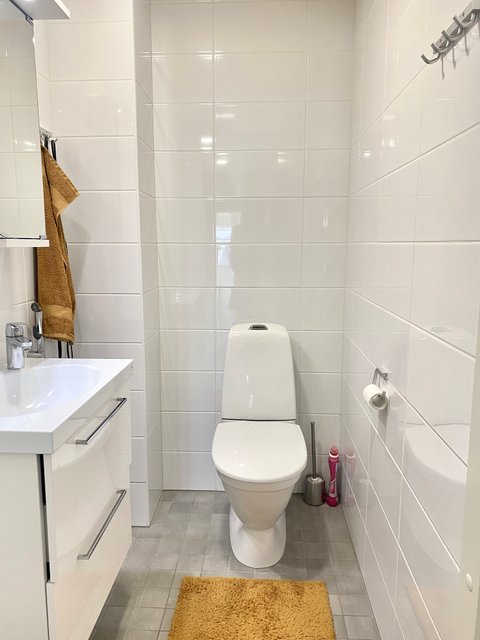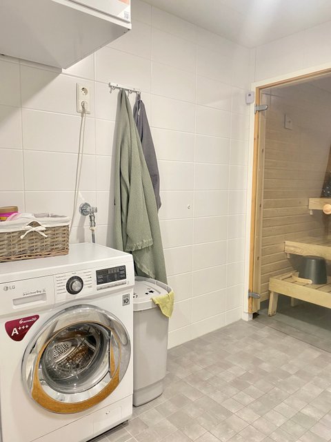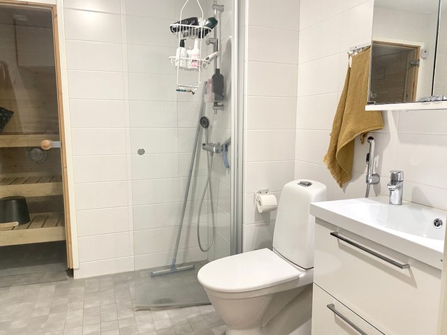 - WC-istuin, suihku, suihkuseinä, pesukoneliitäntä, peilikaappi, ja allaskaappi
