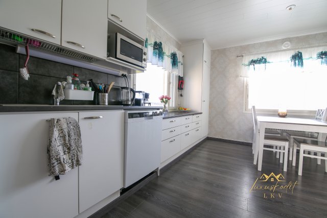 - Jääkaappipakastin, liesi, liesituuletin, astianpesukone, ja leivinuuni.