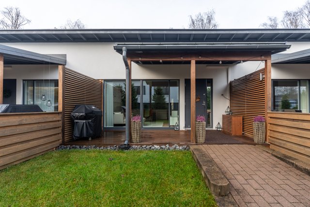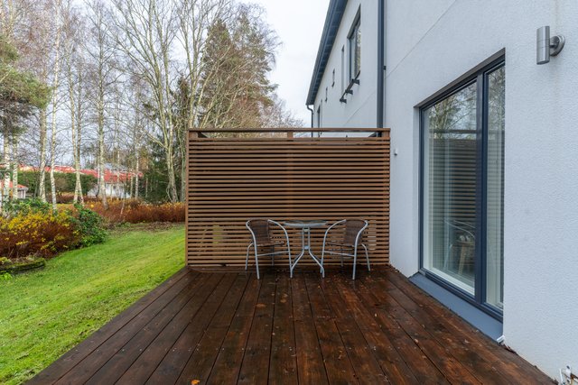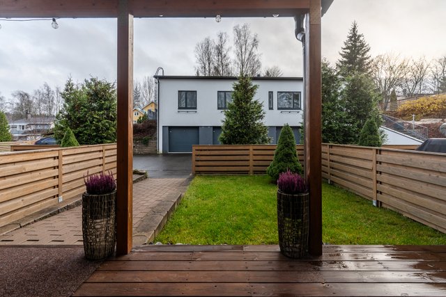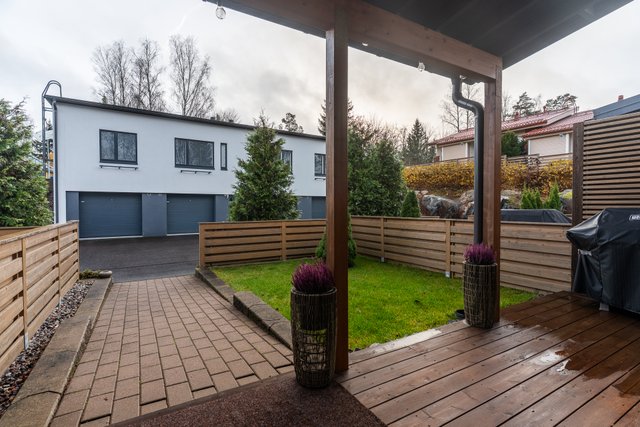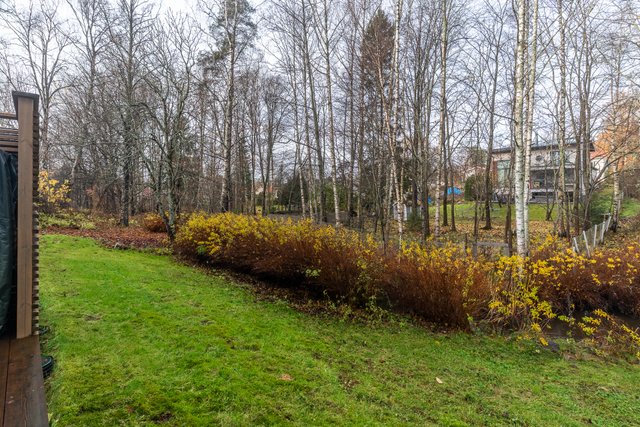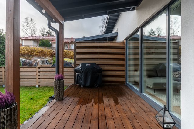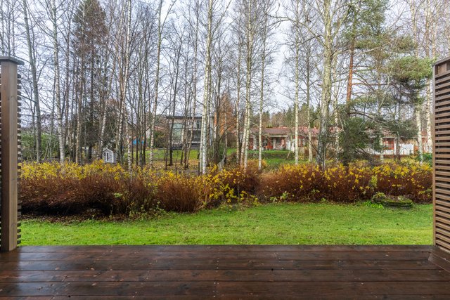 Etupihalla on osittain katettu terassi, jossa on hyvin tilaa ruokailuryhmälle, grillille ja rentoon oleskeluun. Aurinkoinen eteläsuunta takaa valoa ja viihtyisyyttä pitkin päivää. Takapihan terassilta avautuvat upeat, vehreät näkymät puistomaisiin maisemiin. Rauhallinen sijainti ja näkymien tuoma avaruus luovat ihastuttavan yksityisyyden ja luonnonläheisen tunnelman.