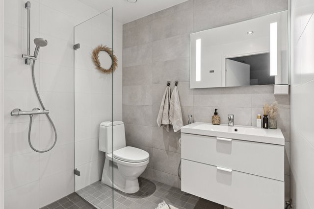 - lattialämmitys, suihku, suihkuseinä, peilikaappi, bidee-suihku. Lattia: laatta. Seinät: kaakeli. Lukumäärä: 2.