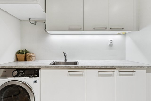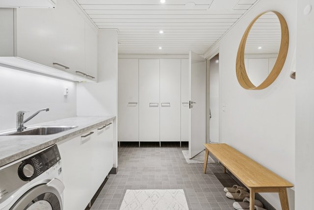 - pesukoneliitäntä, AEG kuivaava pesukone, pesuallas, lattialämmitys, lattiakaivo, pyykkikaapit, pöytätaso. Lattia: laatta. Seinät: kaakeli.
