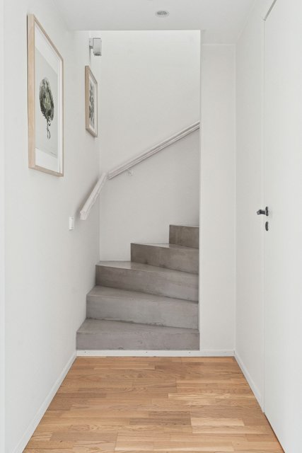 Yläkerrassa, joka toimii sisääntulokerroksena, sijaitsevat kodin päätilat. Olohuone, ruokailutila ja upea keittiö muodostavat kodin sydämen. Näyttävä saareke kutsuu kokkaamaan ja kokoontumaan. Samassa kerroksessa on myös makuuhuone vaatehuoneella sekä toinen kylpyhuone, mikä tekee arjesta erityisen sujuvaa. Olohuoneen puupaneloitu seinä, vankat betoniportaat ja tyylikkäät akustiikkalevyt muodostavat kokonaisuuden, jossa korostuvat kodin tarkasti harkitut yksityiskohdat ja ajaton tyyli. Yläkertaan on asennettu ilmalämpöpumppu, joka tuo raikasta viilennystä kesähelteillä ja lisää asumisen mukavuutta.