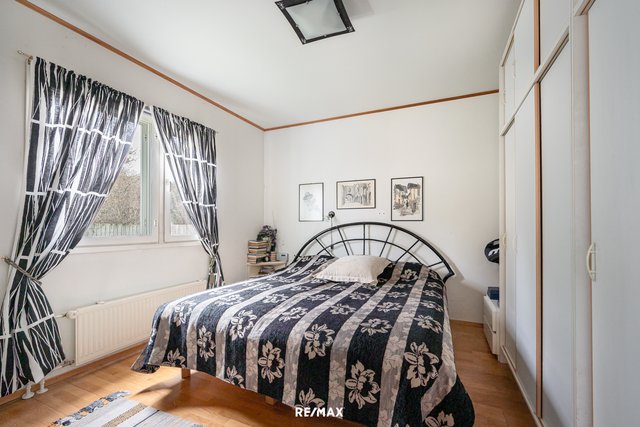 - Suurimmassa makuuhuoneessa parketti, keskikerroksen pienemmässä laminaatti ja yläkerran makuuhuoneissa muovimatto. Yhdessä huoneessa seinät paneloitu, muuten maalattuja muissa makuuhuoneissa.