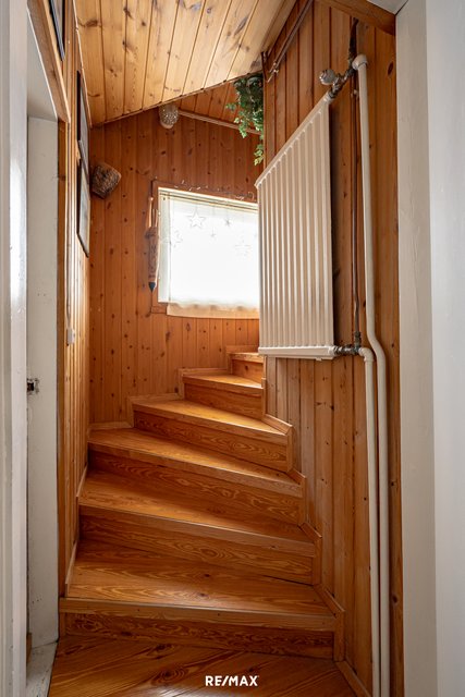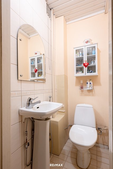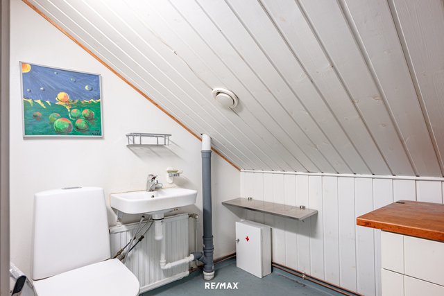 - Keskikerroksen wc:ssä lattiamateriaalina laatta, seinät laattaa ja takaseinä maalattu. Yläkerran wc:ssä muovimatto ja seinä paneelia/maalattu
