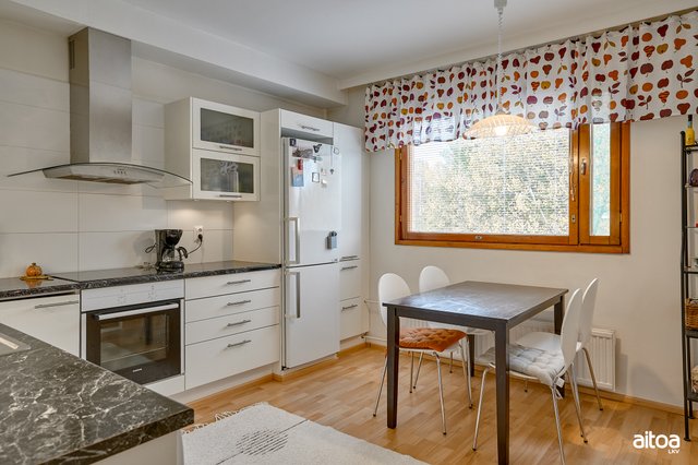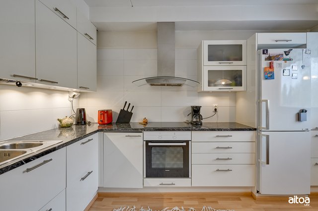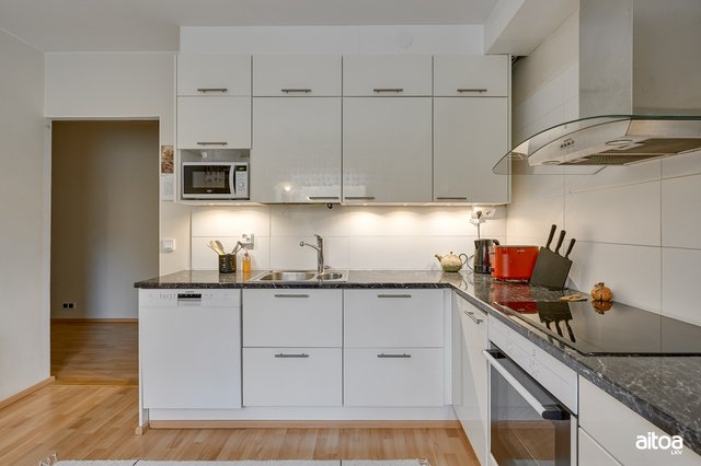 Keittiö ja kylpyhuone on remontoitu vuonna 2014, ja niiden moderni ilme tekee arjesta sujuvaa.