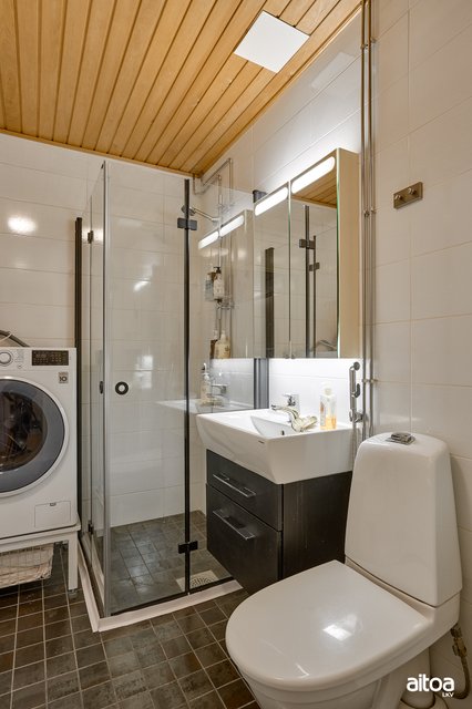 - WC-istuin, pesuallas, peilikaappi, bidee-suihku, suihku, pesukoneliitäntä, allaskaappi, ja suihkuseinä