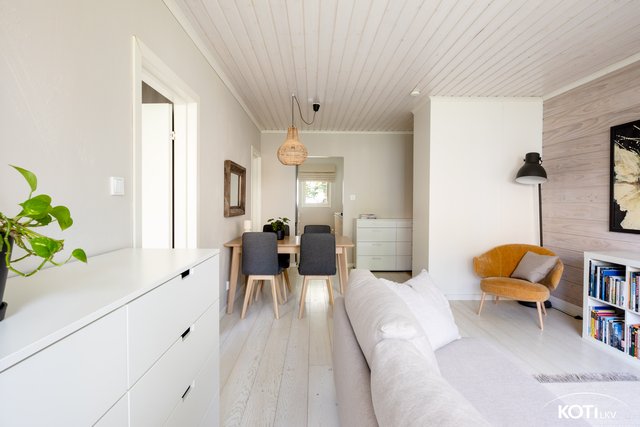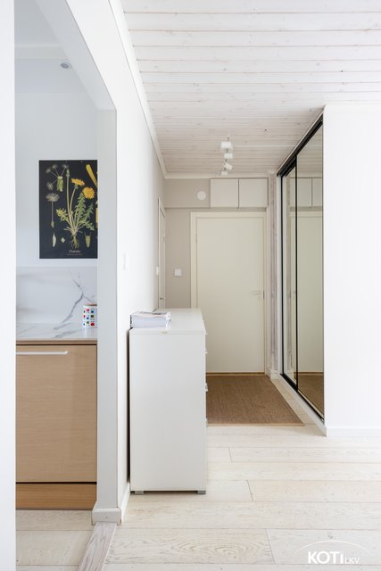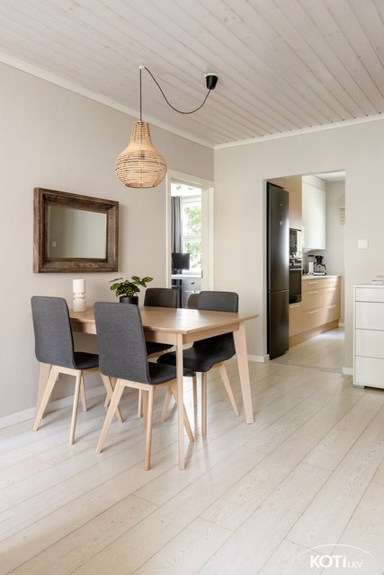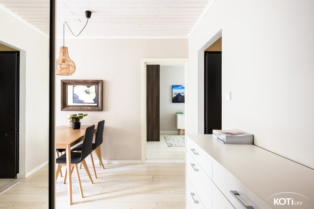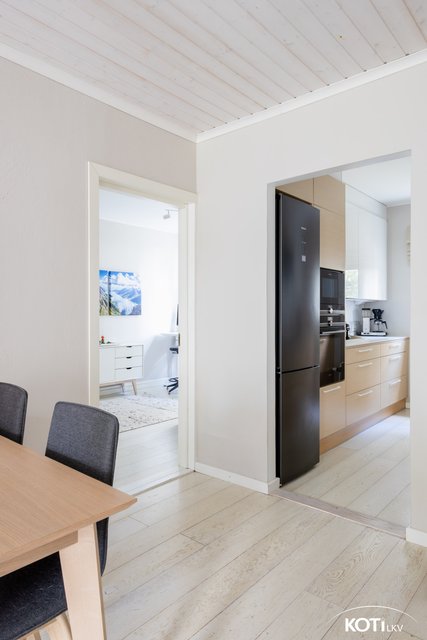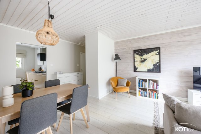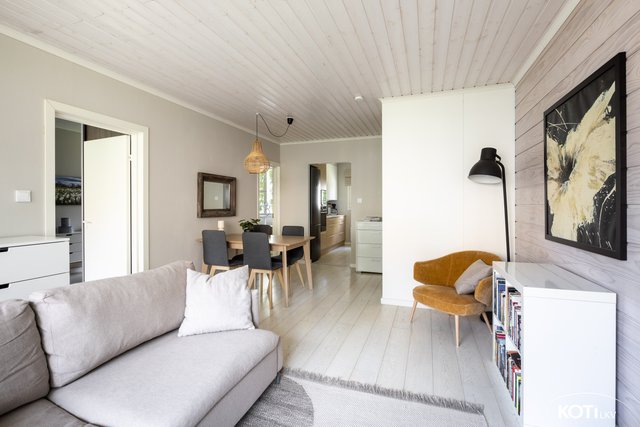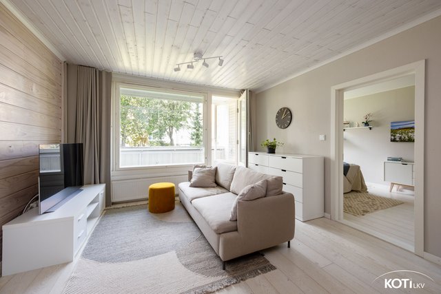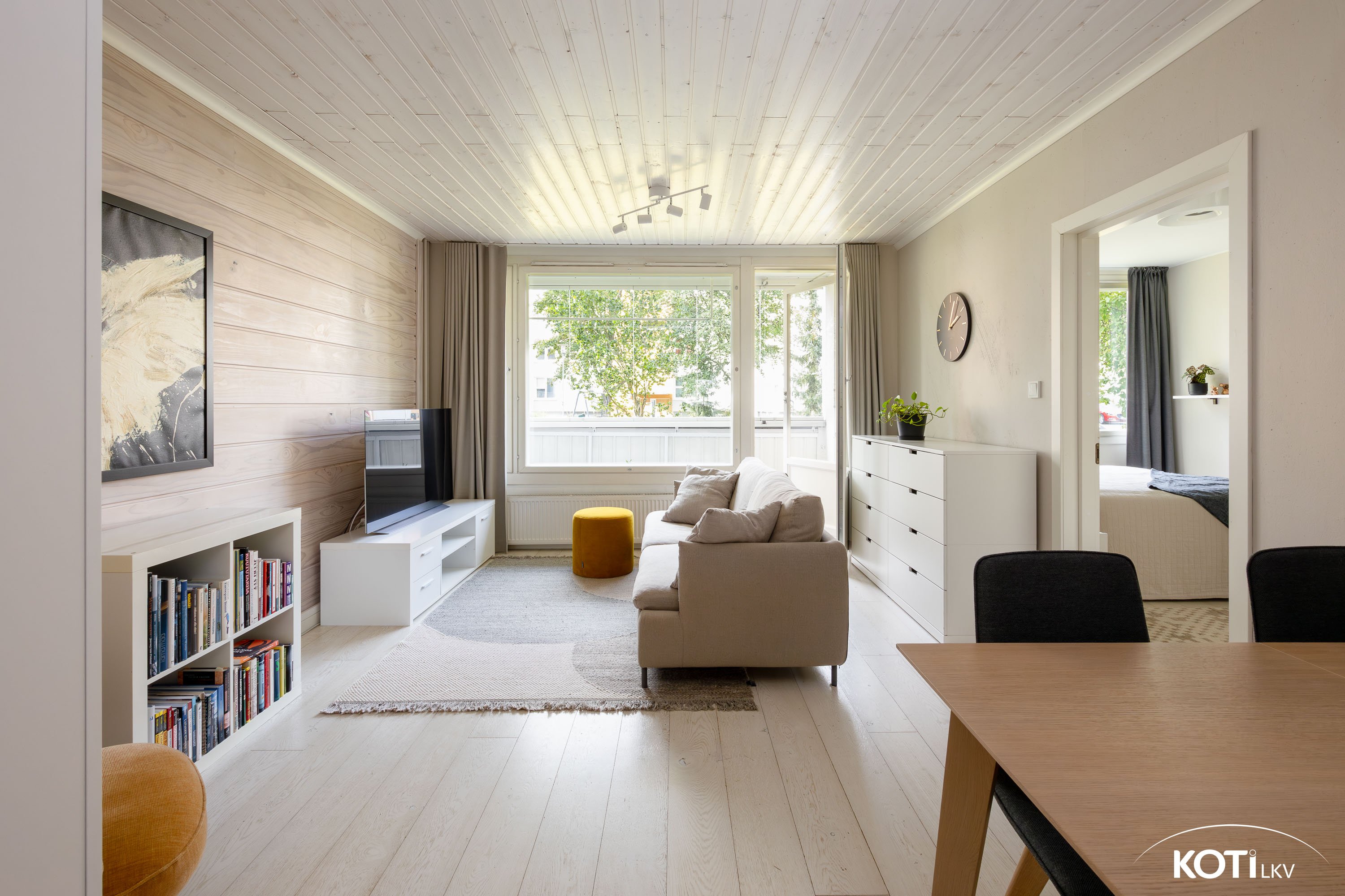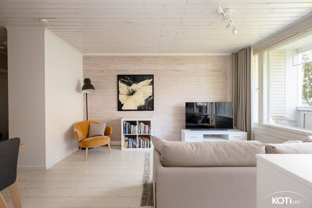 Asunnossa on parkettilattia ja olohuoneessa on vaaleaksi vahattu lämpökäsitelty radiata-mäntyseinä.