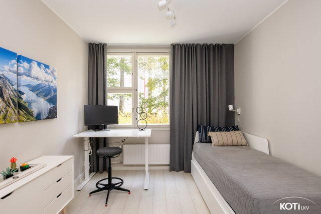 Kauppaan kuuluu mittatilaustyönä teetetty tyylikkäät verhot joka huoneessa.