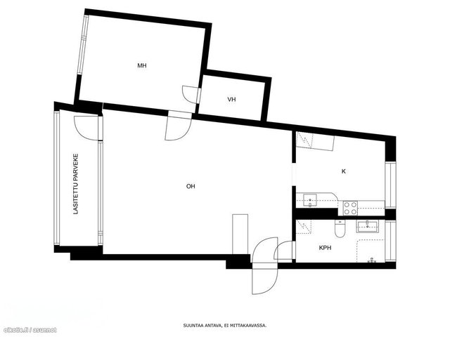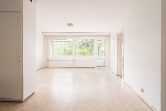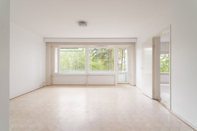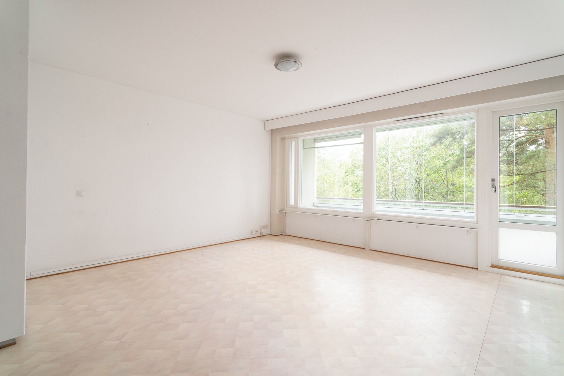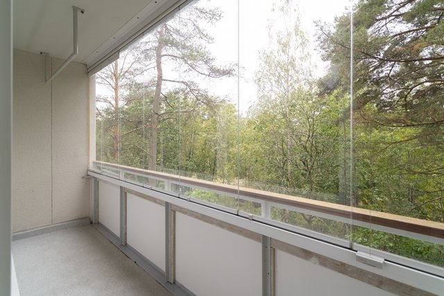Tässä kodissa tilaa ei ole hukattu, vaan pohjaratkaisu on käytännöllinen ja tehokas. Huoneistossa on tilava ja avara olohuone, jonka perältä kulku omalle lasitetulle parvekkeelle. Lasitetulta parvekkeelta avautuvat upeat, rauhalliset ja vehreät maisemat metsikköön. Suojaisa näkymä tuo kotiin luonnon läheisyyttä ja tarjoaa viihtyisän paikan nauttia esimerkiksi aamukahvista. Keittiössä on paljon kaappi- ja laskutilaa ja tila ruokailuryhmälle. Makuuhuone on fiksun kokoinen, eikä säilytystilasta ole puutetta vaatehuoneen ansiosta. Täysin remontoitu, ikkunallinen kylpyhuone yhdistää modernin ilmeen ja toiminnallisuuden – myös pyykkihuollolle löytyy hyvin tilaa.