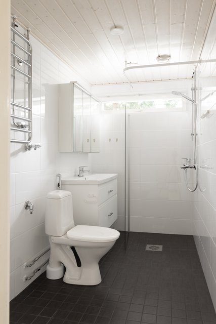 - WC-istuin, suihku, suihkuseinä, peilikaappi, allaskaappi, bidee-suihku, pesukoneliitäntä, ja pesuallas