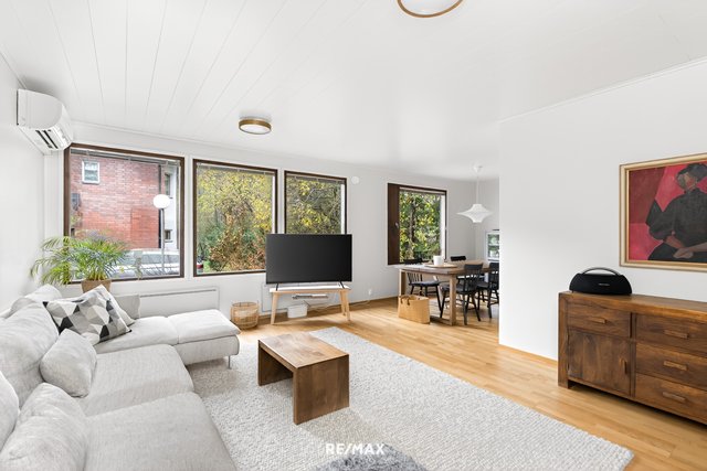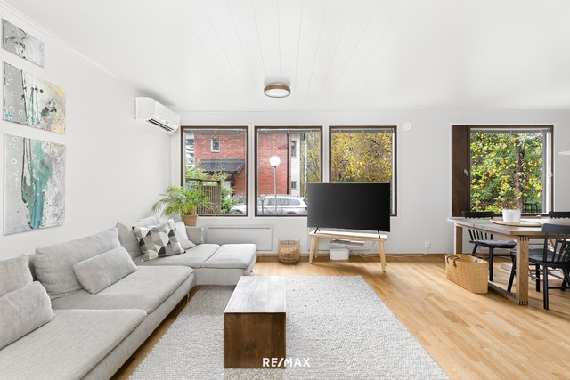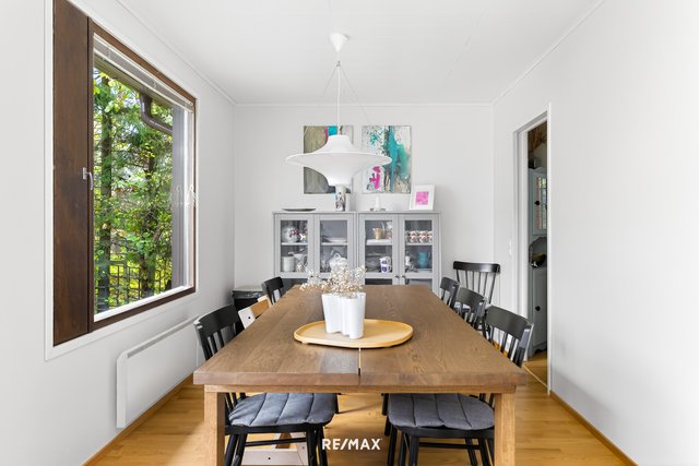 Olohuone on viihtyisä ja suurista ikkunoista tulvii luonnonvaloa. Erillään oleva keittiö on uusittu moderniksi ja viereiseen olohuoneen yhteydessä olevaan ruokailutilaan mahtuu suurempikin pöytä.