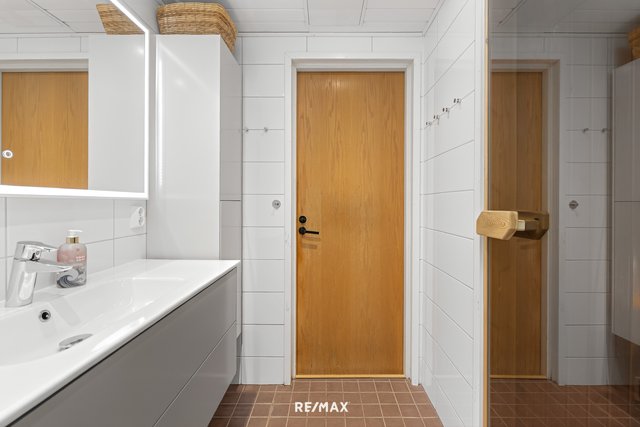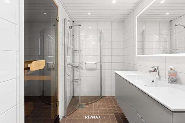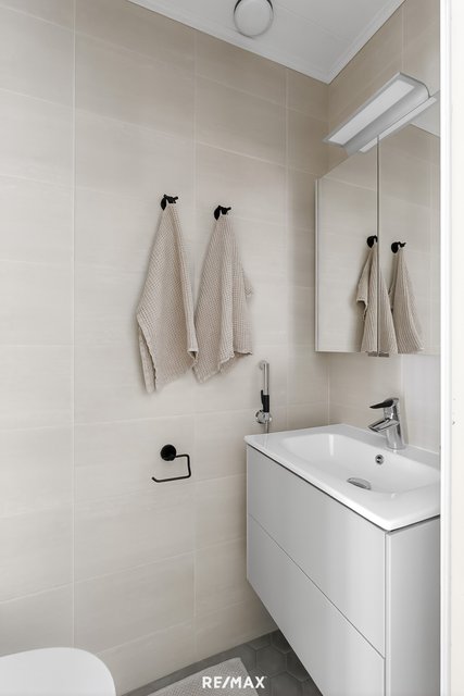 - Uusittu 2016. Allastaso, allaskaappi, kaappi, peili uusittu 2021. Suihku, kääntyvät suihkuovet. Seinät ja lattia laatoitettu, mukavuuslattialämmitys.