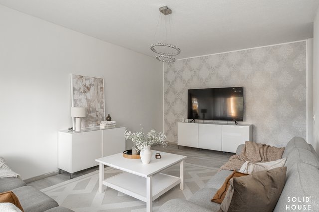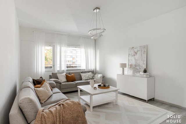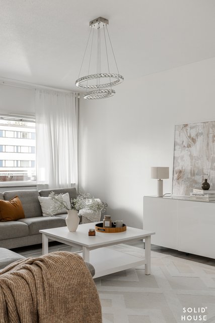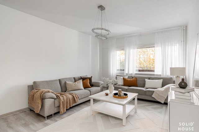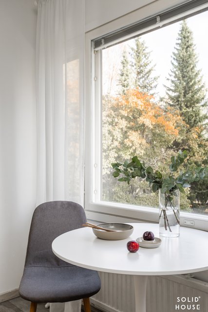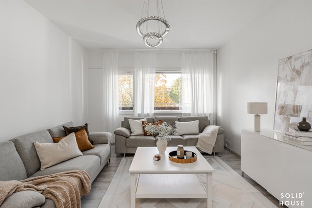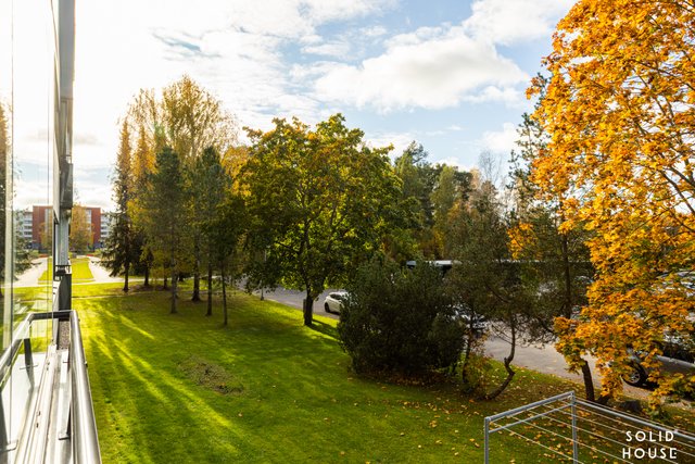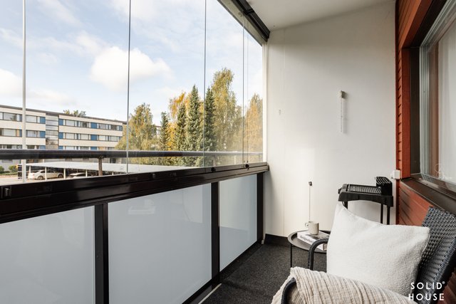 Itä–länsisuunta tuo asuntoon luonnonvaloa koko päivän ajan. Aamuaurinko valaisee keittiön ja iltaisin valo tulvii tilavaan olohuoneeseen. Olohuone on selkeä ja helposti kalustettavissa, ja sieltä on käynti lasitetulle parvekkeelle, joka tarjoaa mukavan paikan rentoutumiseen tai vaikkapa kasvien kasvatukseen.