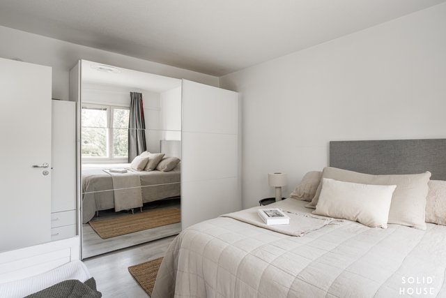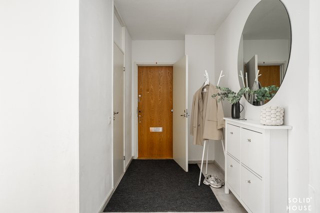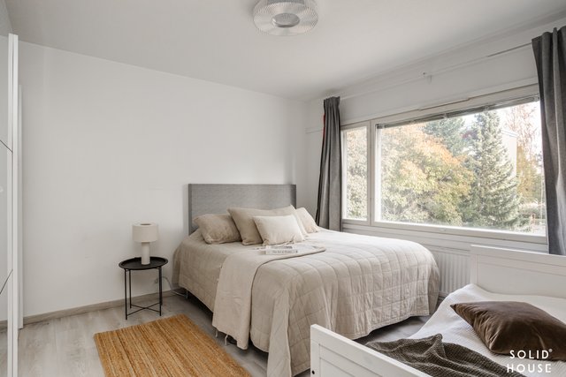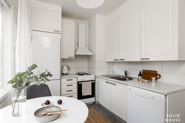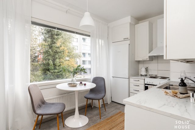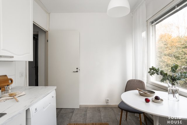 Keittiö on käytännöllinen ja tarjoaa hyvät puitteet arjen ruokailuille. Makuuhuoneessa on runsaasti kaappitilaa, ja vuonna 2018 remontoitu kylpyhuone on raikas ja ajaton vaaleine pintoineen.