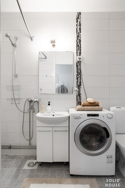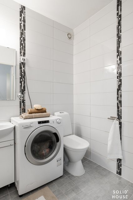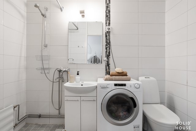- WC-istuin, suihku, bidee-suihku, pesukoneliitäntä, pesuallas, allaskaappi, ja peili