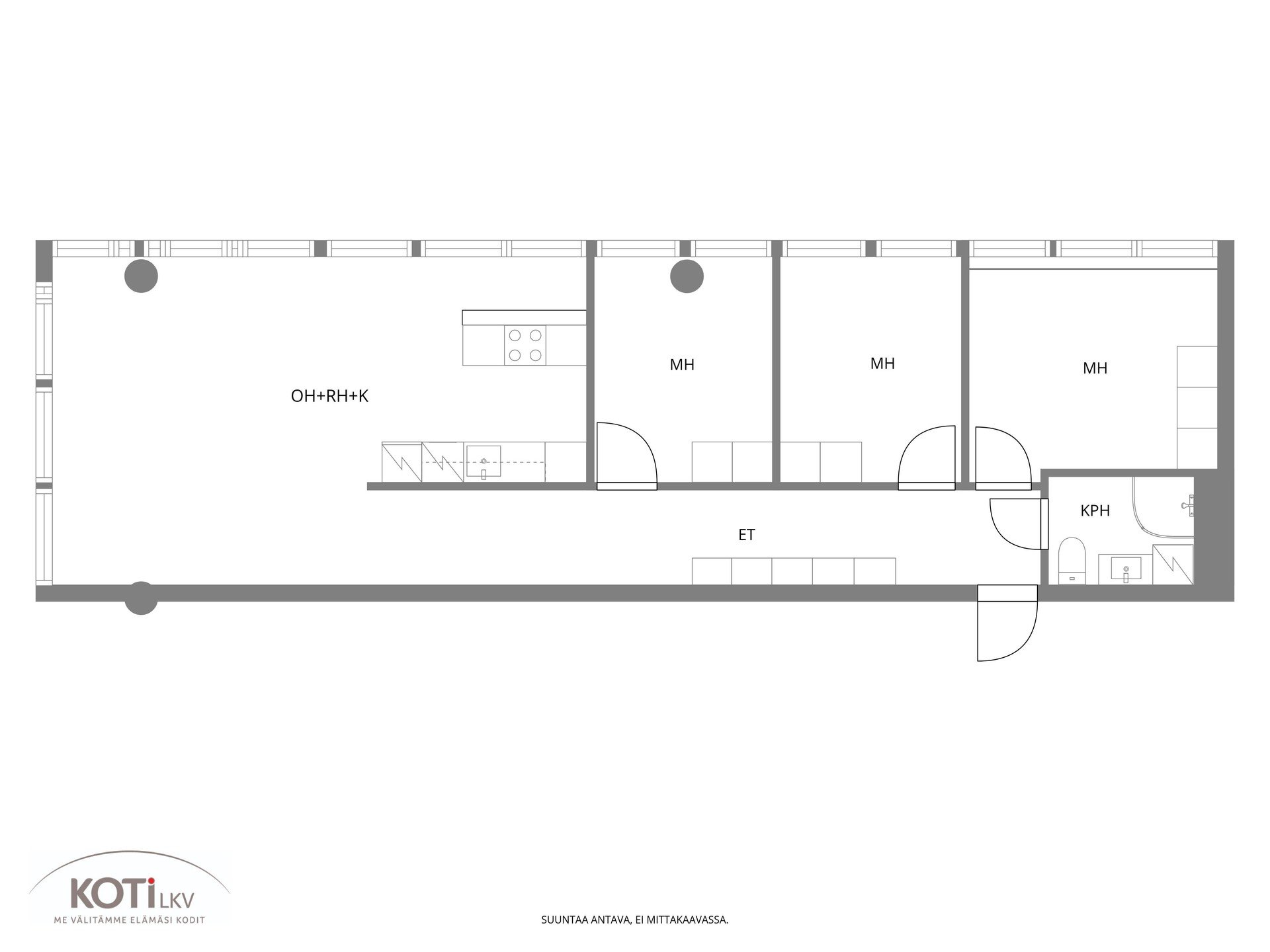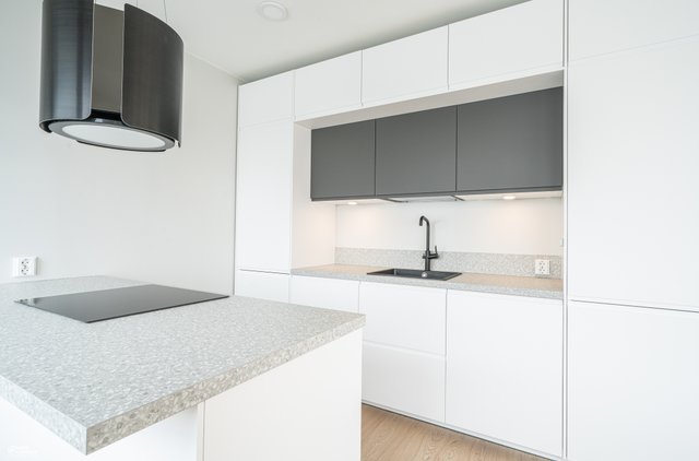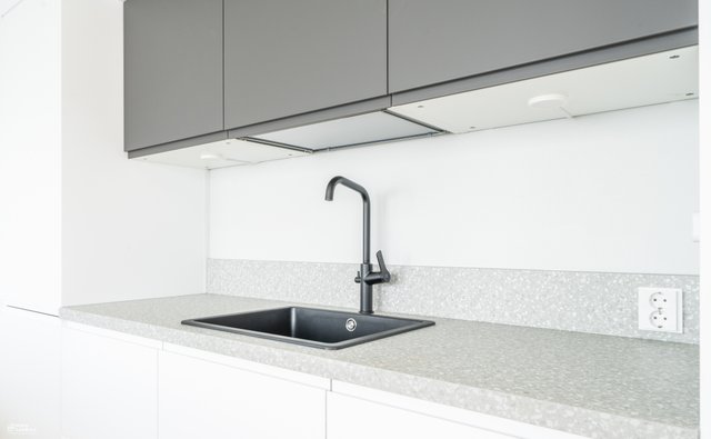 - Keittiösaareke, jossa induktio liesitaso, erillisuuni ja säilytystilaa. Laminaattitaso. Klarstein liesituuletin. Integroidut jääkaappipakastin ja astianpesukone (uusittu 2021). Gustavsberg -hana. Laminaattitaso. Pistorasia myös kaapin sisällä. Kiinteät valaisimet. Lattia laminaattia.