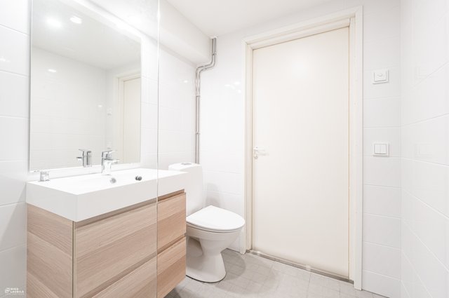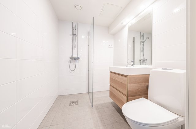 - Suihku, suihkuseinä, wc -istuin, käsisuihku, allaskaappi, peili, pesukoneliitäntä, lattialämmitys. Seinäpinnat valkoista kaakelia, lattia vaalean harmaata laattaa.