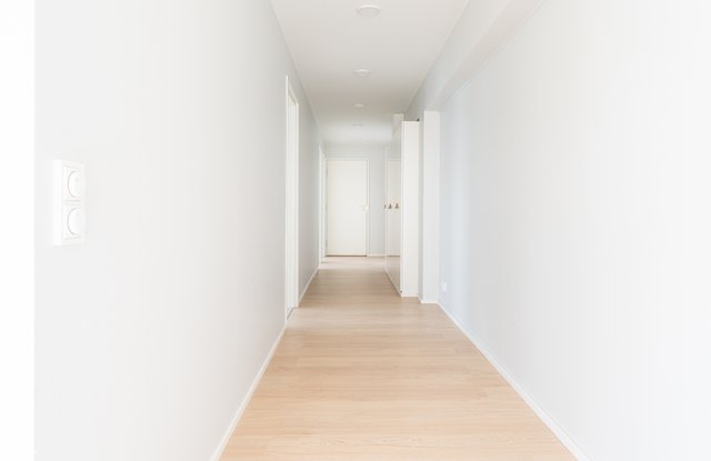 - Käytävällä ja olohuoneessa kiinteät valaisimet.