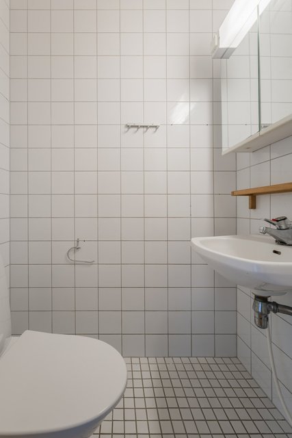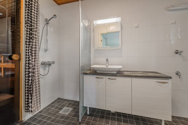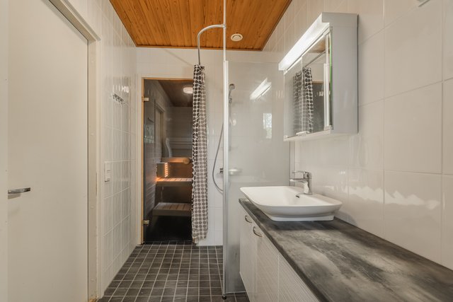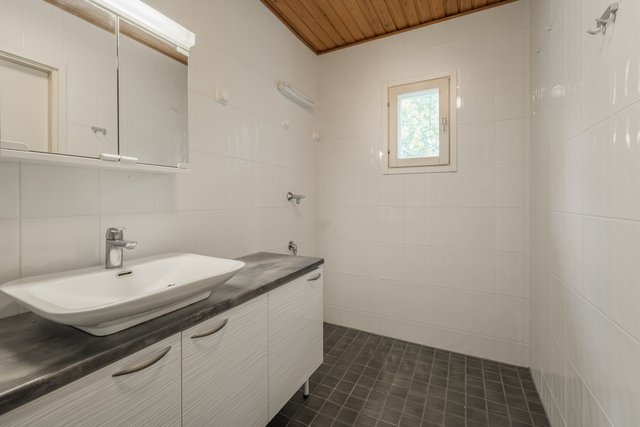 - Suihku, suihkuseinä, pesukoneliitäntä, allaskaappi, pesuallas, ja peilikaappi