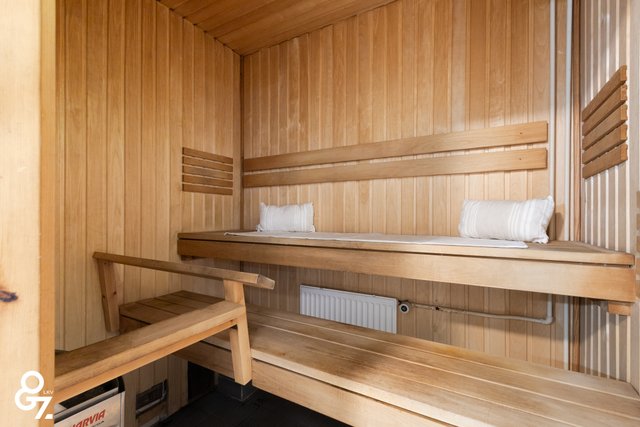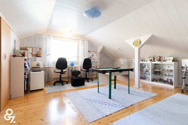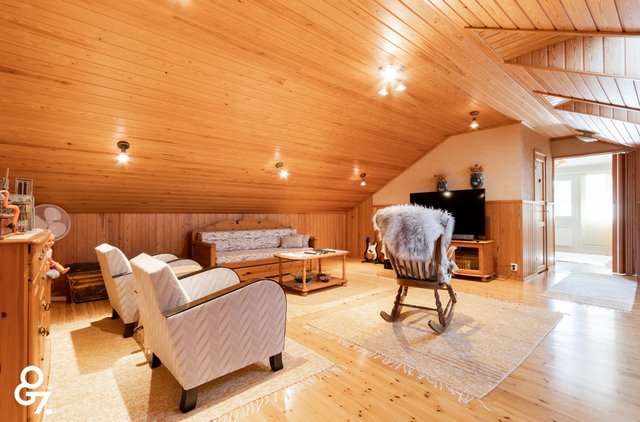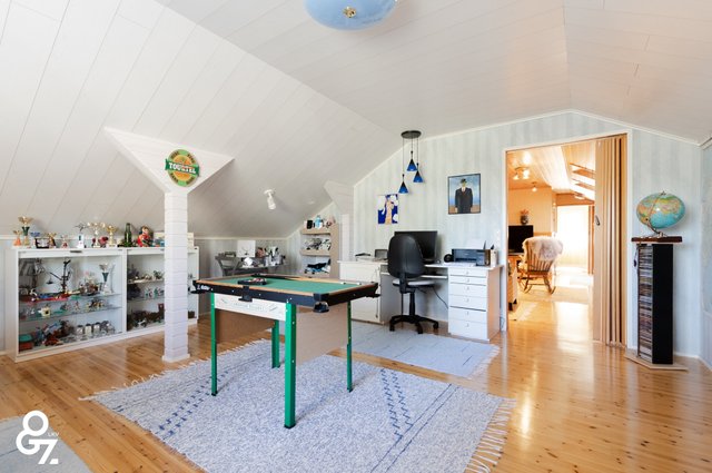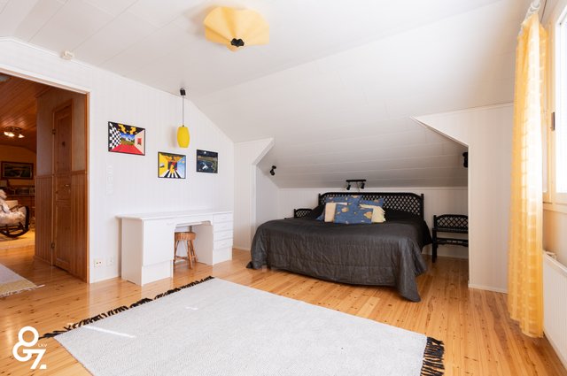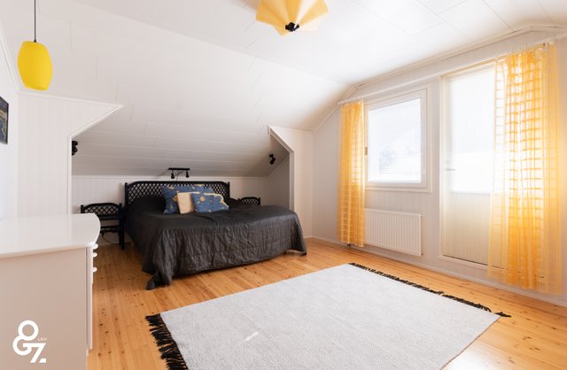 Talossa on neljä makuuhuonetta, jotka tarjoavat tilaa suuremmallekin perheelle. Pienellä muutoksella olohuoneesta saa yhden makuuhuoneen lisää. Olohuoneen lämpöä tuo varaava takka ja tilava keittiö on suunniteltu siten, että sinne mahtuu samanaikaisesti enemmänkin kokkaajia. Saunaosasto tarjoaa rentoutumismahdollisuuksia ja samassa yhteydessä on hyvin kodinhoitotilaa. Wc löytyy sekä ala- että yläkerrasta. Ylhäällä on vaikuttava iso aulatila kattoikkunoineen ja talon eteläpäädystä löytyy suojaisa parveke makuuhuoneen yhteydestä. Autotalleja on talossa kaksi ja tämän lisäksi löytyy autokatos pihalta.
