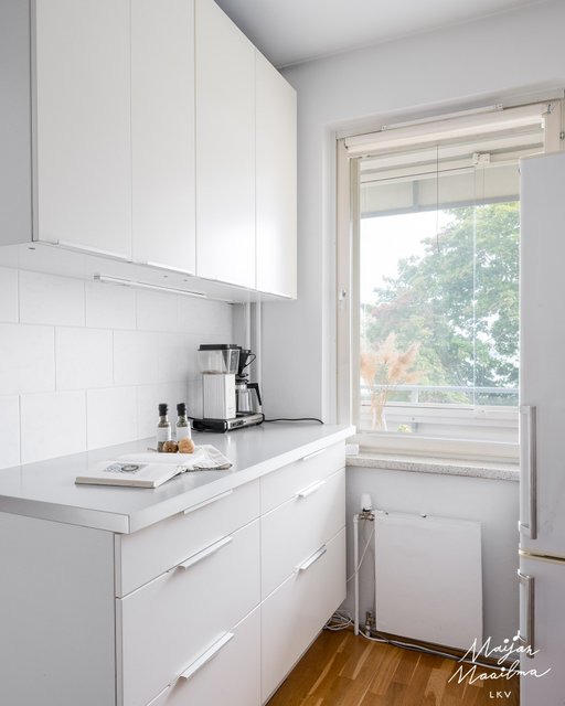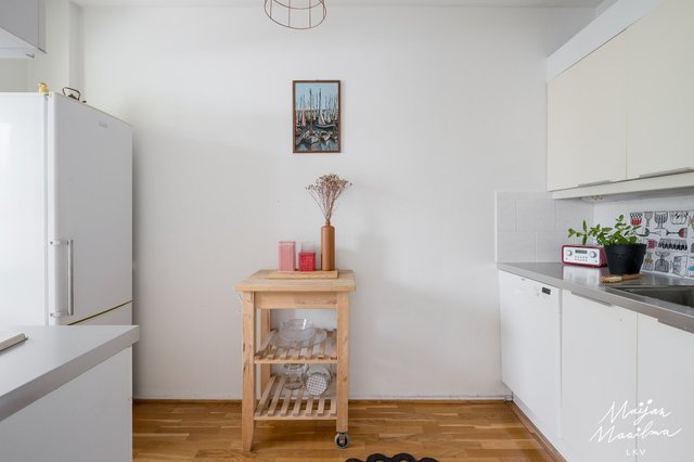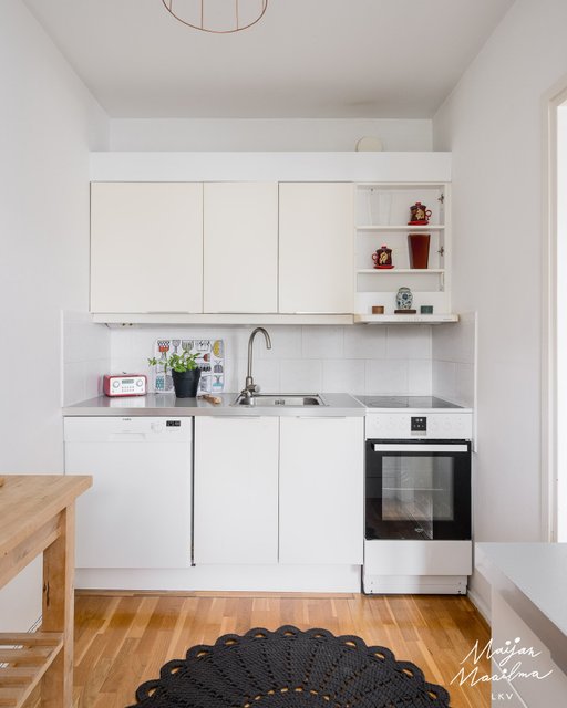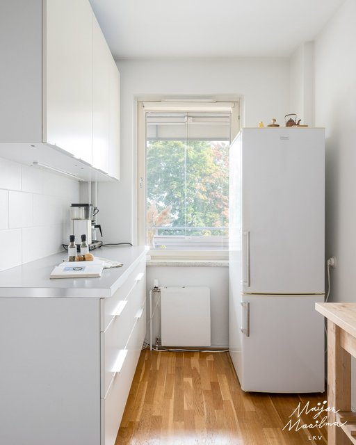 - Parkettilattia, maalatut seinät. Valkoiset keittiökaapistot. Liesi, uuni, liesituuletin, astianpesukone ja jääkaappi-pakastin.