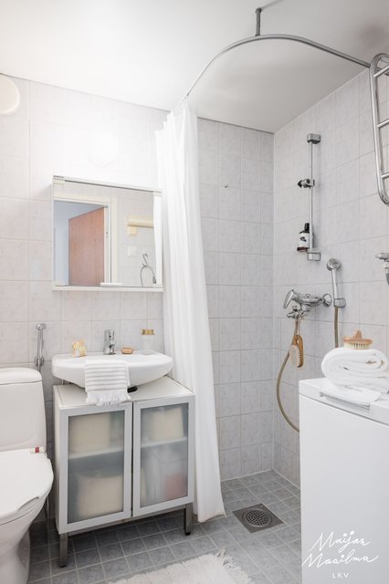 - Kylpyhuone/wc: Lattia laattaa, seinät laattaa. Allas, allashana, allaskaappi, peilikaappi ja suihku. Pesukoneliitäntä, pyyhepatteri, wc-istuin.