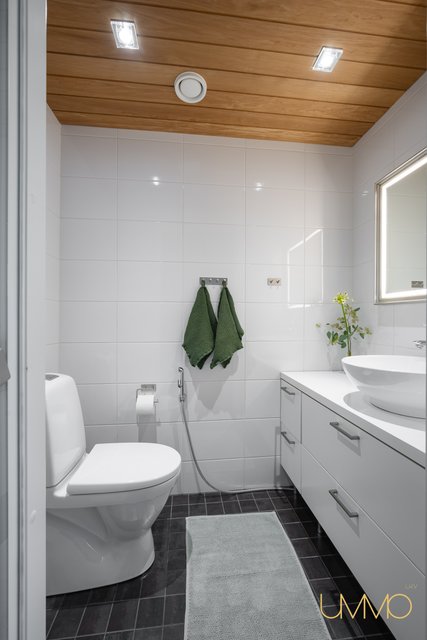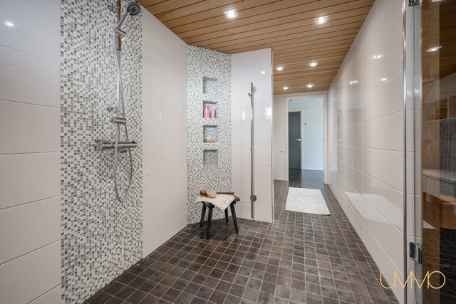 - Alakerrassa 2kpl sadesuihkua. Alakerran kylpyhuoneen yhteydessä pukuhuonetila. Keskikerroksen wc:ssä (suihkuvaraus)