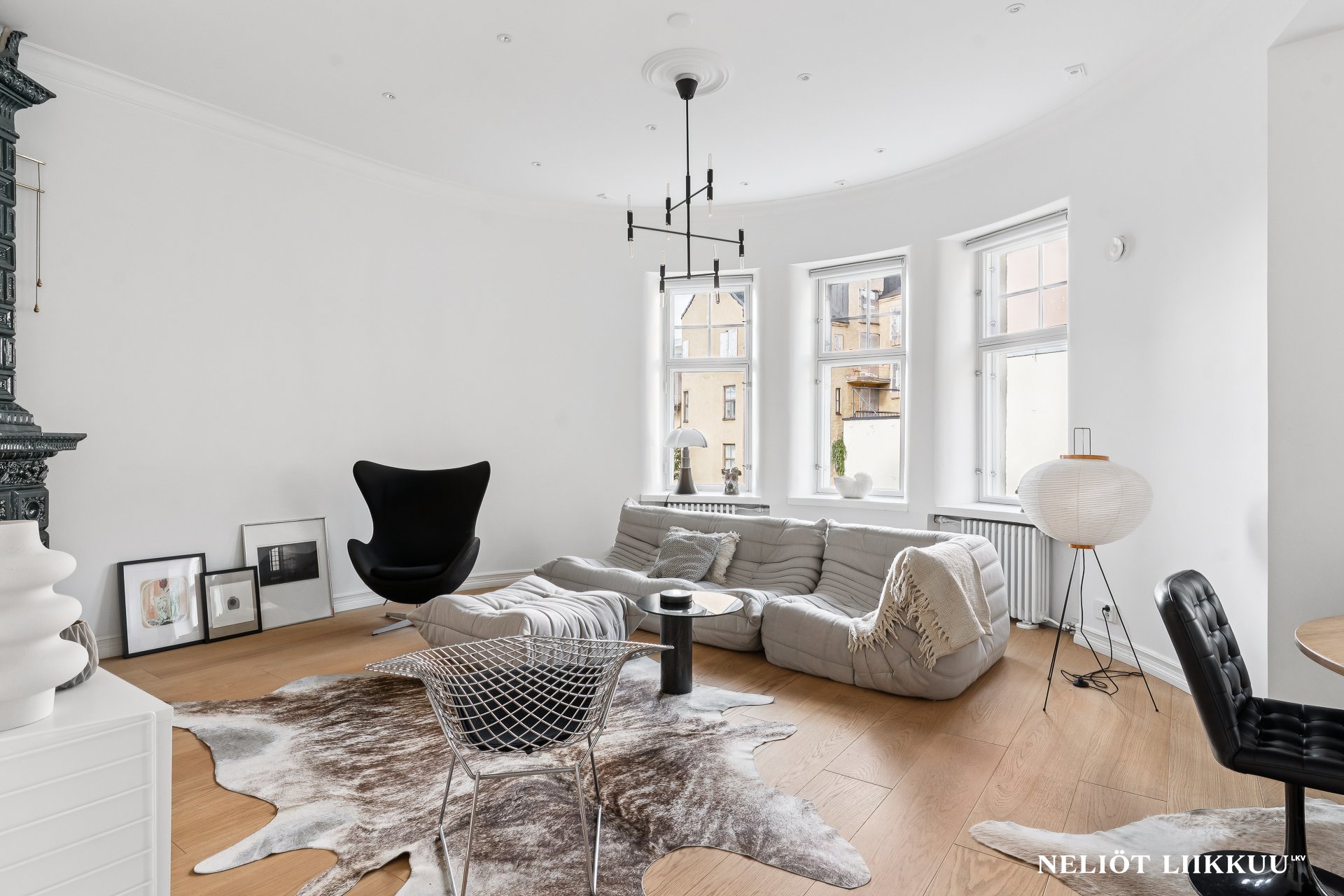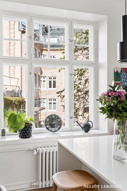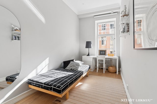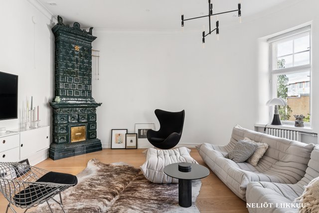 Kolmannen kerroksen asunnossa on avokeittiö, jossa on laadukkaat Electroluxin kodinkoneet ja tyylikäs keittiösaareke, joka toimii täydellisesti niin arjen kuin juhlan keskuksena. Olohuoneessa on aikakauden mukainen erittäin näyttävä kaakeliuuni, jossa on biopolttoaineelle sydän. Asunnon kolme makuuhuonetta tarjoavat tilaa perheelle tai työskentelyyn kotona, ja reilun kokoinen master bedroomin yhteydessä oleva vaatehuone tuo lisää säilytystilaa.