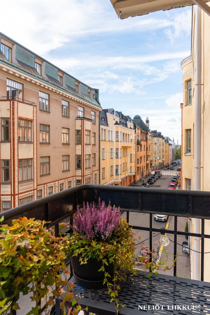 Kylpyhuone ja erillinen WC on varustettu modernilla mukavuudella, kuten lattialämmityksellä ja laadukkailla Oras-sadesuihkuilla. Lisäksi asunnossa on parveke, jolta avautuu näkymä kadulle. Sisäpiha on vehreä, jossa ei ole autopaikoitusta.