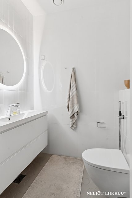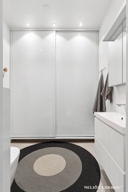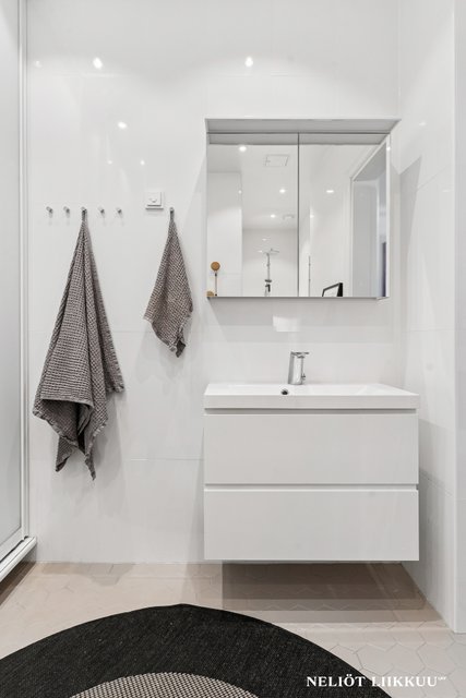 - WC-istuin, suihku, pesukoneliitäntä, lattialämmitys, peilikaappi, peili, pesuallas, allaskaappi, ja bidee-suihku