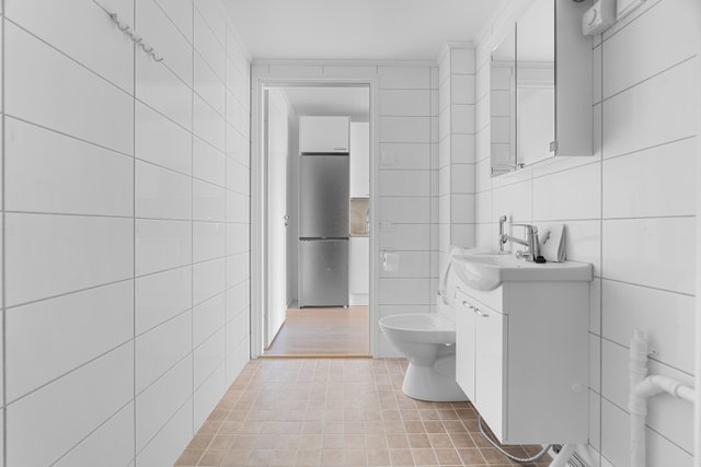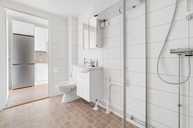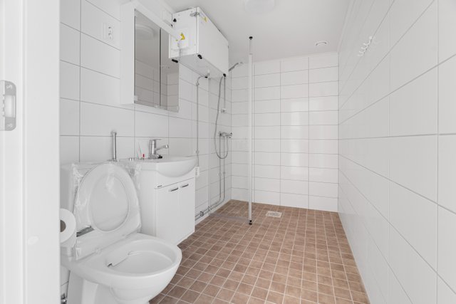 - WC-istuin, suihkuseinä, pesukoneliitäntä, lattialämmitys, allaskaappi, peilikaappi, suihku, ja bidee-suihku