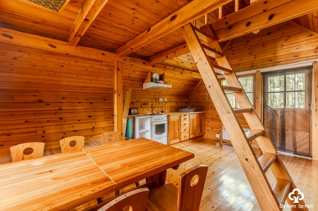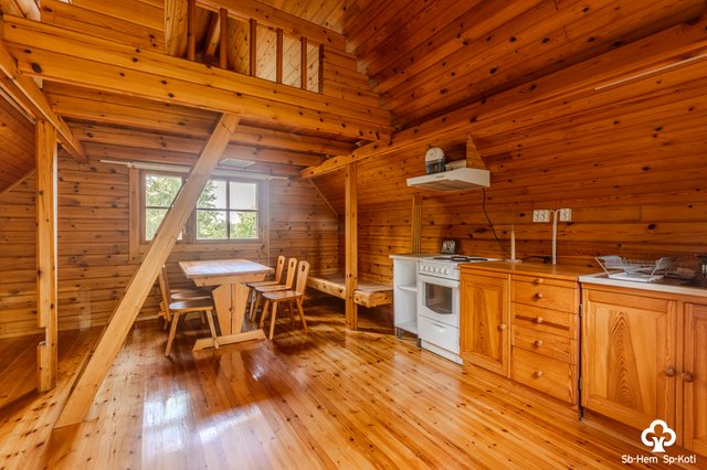 Mökin tupakeittiö on valoisa, ja suuret ikkunat tuovat runsaasti luonnonvaloa sisään. Parvella on mukavasti tilaa nukkumiselle, ja erillisessä rakennuksessa sijaitseva puulämmitteinen sauna kutsuu rentoutumaan.
