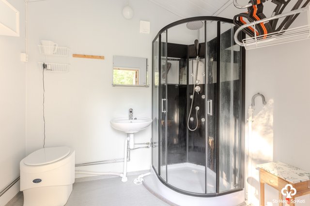 - WC-istuin (Separett), suihku, suihkukaappi, pesukoneliitäntä, peili, ja pesuallas