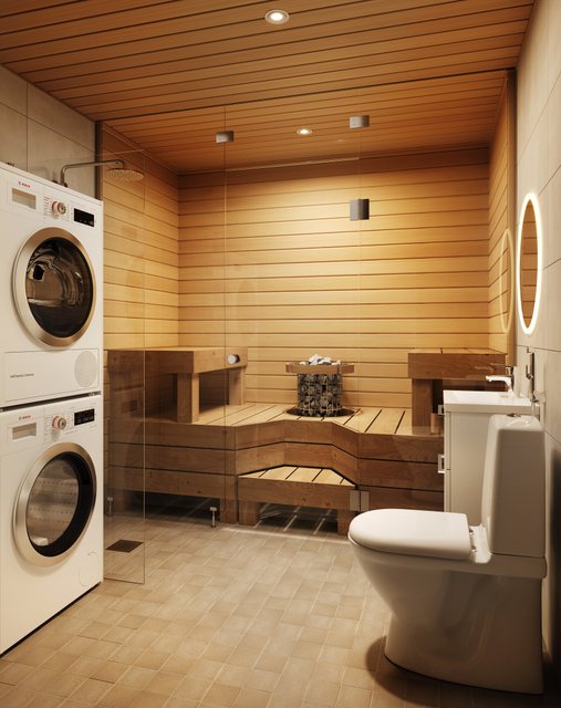 - WC-istuin, suihku, suihkuseinä, pesukoneliitäntä, allaskaappi, peili, bidee-suihku, ja lattialämmitys