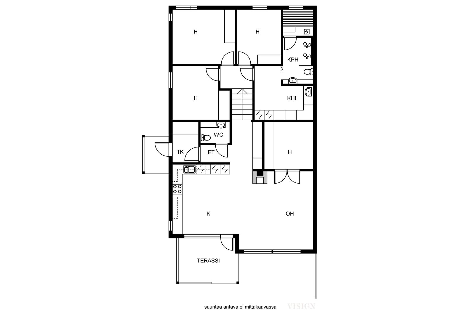- Erillisuuni, liesi, jääkaappi, mikroaaltouuni, astianpesukone, erillinen pakastin, ja liesituuletin / hormi, kiinteät valaisimet