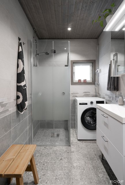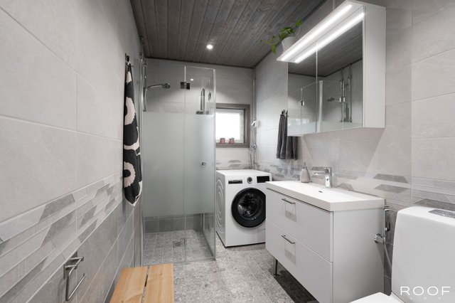 - WC-istuin, suihku, pesukoneliitäntä, lattialämmitys (sähköllä toimiva), suihkuseinä, peilikaappi, kiinteät valaisimet, allaskaappi, ja bidee-suihku