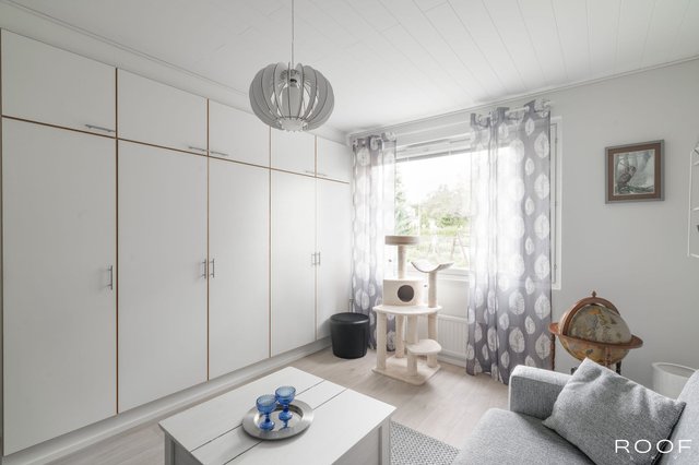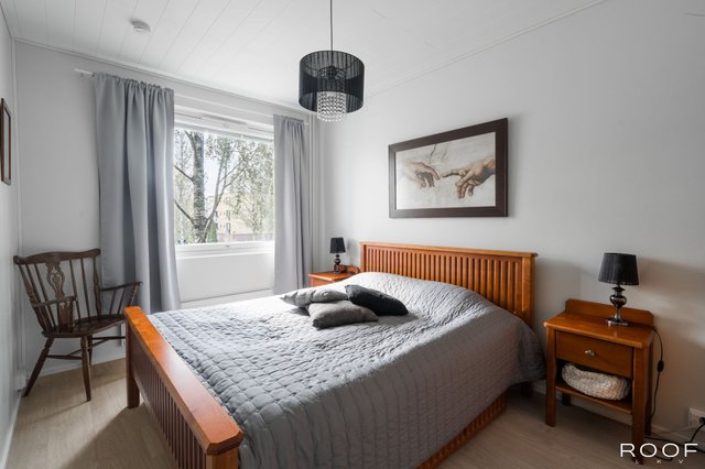- Toisen makuuhuoneen yhteydessä on vaatehuone, toisessa makuuhuoneessa on kaapistot. Molemmat makuuhuoneet ovat tilavia.