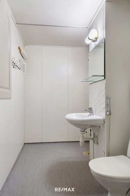 - WC-istuin, suihku, pesukoneliitäntä, peili, pesuallas, bidee-suihku, ja suihkukaappi