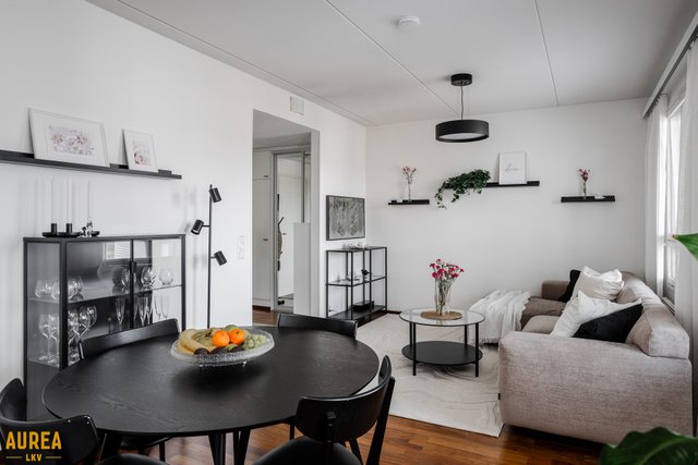 - Olohuone yhtenäistä tilaa ruokailutilan kanssa. Olohuoneesta käynti lasitetulle parvekkeelle. Tauluhyllyt kuuluvat kauppaan.