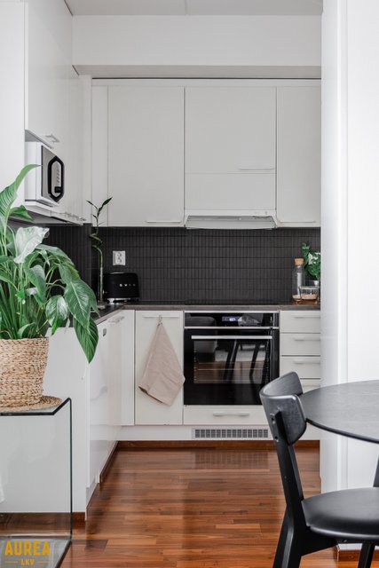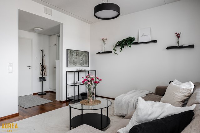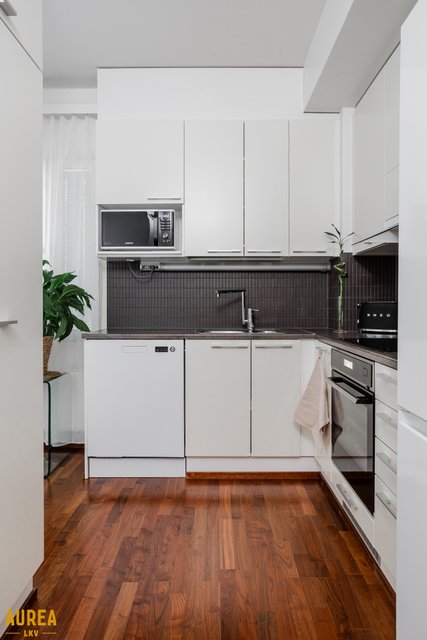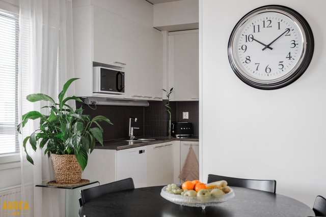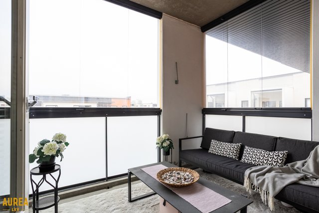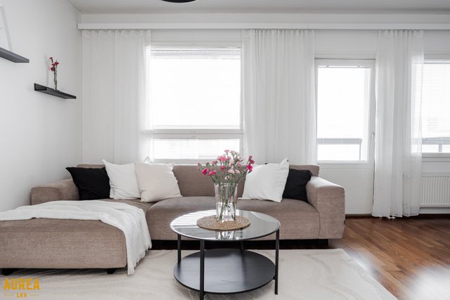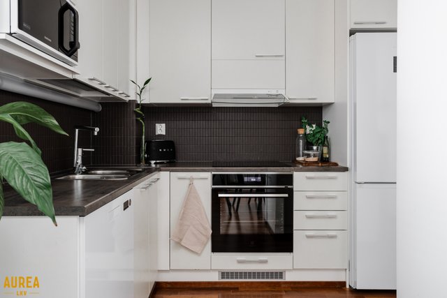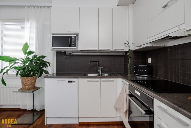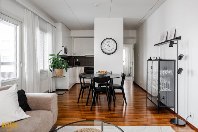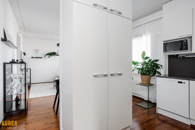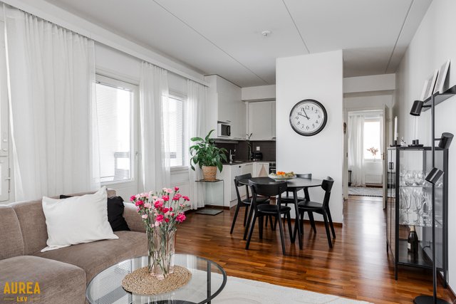 Keittiö ja olohuone muodostavat yhtenäisen, avaran kokonaisuuden. Vaaleasävyinen keittiö on varusteltu laadukkailla kodinkoneilla. Olohuoneesta on kulku lasitetulle parvekkeelle, jossa voi nauttia aamukahvin suojassa säältä. Täällä myös ilta-aurinko paistaa pitkään.