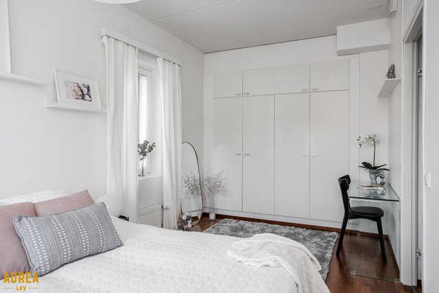 - Tilava makuuhuone, ikkunat kahteen ilmansuuntaan. Kiintokaapistoja.