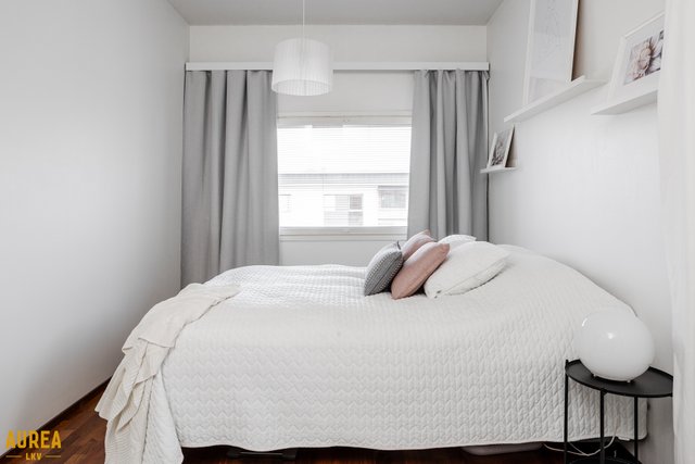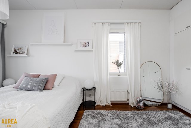 Tilava, talon kulmassa sijaitseva makuuhuone mahdollistaa monipuolisen sisustamisen, ja kylpyhuoneen yhteydessä sijaitseva sauna kutsuu rentoutumaan omassa rauhassa. Koti on kaiken kaikkiaan todella valoisa ja siistissä kunnossa. Muuttamaan pääsee siis ilman remonttihuolia.