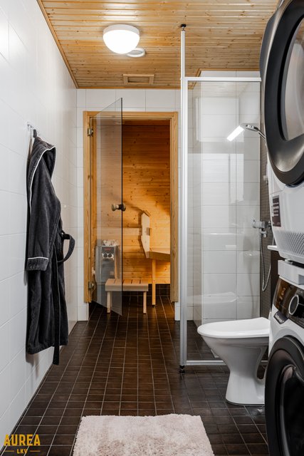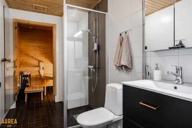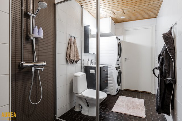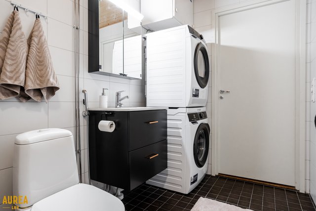 - WC-istuin, suihku, suihkuseinä, allaskaappi (Uusittu 2020), pesuallas (Uusittu 2020), peilikaappi (Uusittu 2020), bidee-suihku, pesukoneliitäntä, ja lattialämmitys