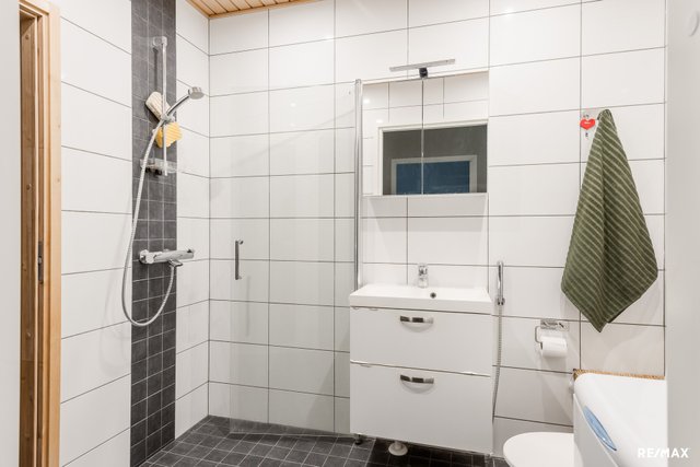 - WC-istuin, suihku, peilikaappi, pesuallas, lattialämmitys, bidee-suihku, allaskaappi, ja pesukoneliitäntä