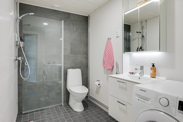 - Varustus: pesukoneliitäntä, lattialämmitys, wc-istuin, suihku, peili, kiinteät valaisimet, kylpyhuonekaapisto. Lattia: laatta. Seinät: kaakeli.