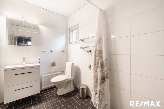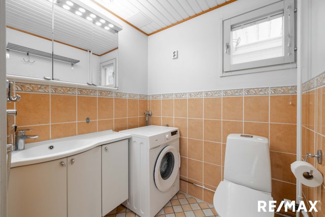 - WC-istuin, peilikaappi, pesuallas, allaskaappi, pesukoneliitäntä, ja bidee-suihku