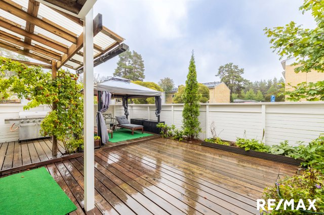 The front yard of the apartment has a sheltered entrance through a partially covered and tiled yard, and the backyard has a cozy terrace area with renewed terrace decking. This provides an ideal place to enjoy summer days and barbecues with family and friends.